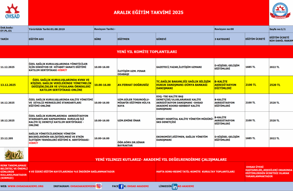 OHSAD AKADEMİ ARALIK Eğitim takvimini sunar.
