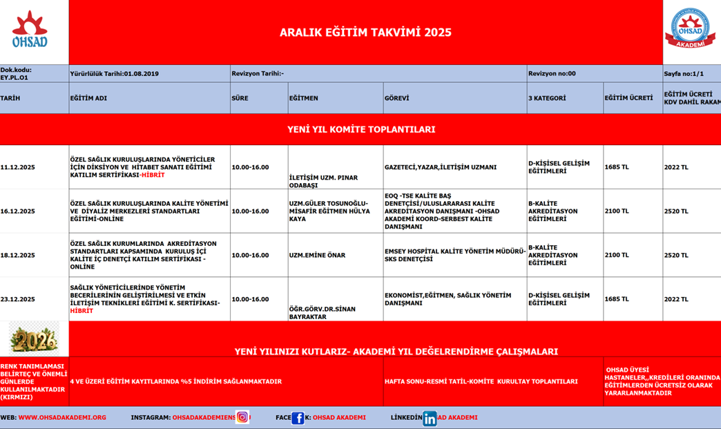 EĞİTİMİN AMACI:Hastanelerde Kalite Bölümünü kuracak veya daha ileri seviyeye taşıyacak yönetici veya yönetici adayların, veya bölüm kalite sorumlularının kalite, TUSKA AKREDİTASYON standartları, gösterge, doküman yönetimi alanında farkındalığını artırarak, gelişimlerine katkı sağlamak, belgelendirme hazırlıklarını ve denetimleri verimli geçirmeler için eğitim program açılmıştır.